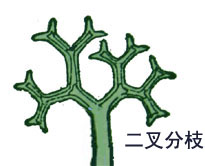 二叉分枝的特点是茎的顶端生长点分成两个,每个生长点各形成一个分枝,并且在一定时候又进行同样的分枝,因此这种分枝统称二叉分枝。苔藓植物和蕨类植物中的石松、卷柏、芒箕骨等具这种分枝方式。