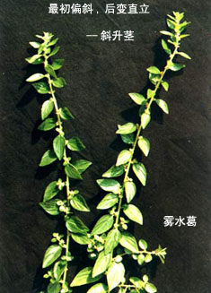 植株幼时茎偏斜而上,但决不横卧地面,随着生长茎的上部逐渐变直立,长成后植株下部呈弧曲状,上部呈直立状。该类茎的质地、粗细不一,可为草本,亦可木本。如酢浆草、山黄麻、鹅不食草等 。