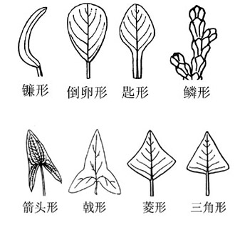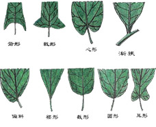 叶的形状 (上)(一)叶片的形状 叶片的形状是指叶片的轮廓,常见的叶形有以下几种: 1. 针形──叶片细长如针,如松的叶。 2.线形──叶片狭长,长度为宽度的5倍以上,又叫带形,如稻、麦等。 3.披针形──叶基较宽,先端尖细,长度约为宽度的3倍,如柳、桃等。 4.椭圆形──全形椭圆,中部最宽,尖端和基部都是圆形,如樟、芫花。 5.卵形──形如鸡卵,下部圆阔,上部稍狭,如向日葵、苎麻等。 6.倒卵形──与卵形相反,叶片上部广阔,下部稍狭,如木兰和马齿苋。 7.心形──形如心脏,基部宽圆而微凹,先端渐尖,如紫荆。 8.肾形──形如肾脏基部凹入,先端钝圆,宽度大于长度,如积雪草、冬葵等。 9.圆形──形如圆盘,长宽接近相等。 10.扇形──形如展开的折扇,顶端宽而圆,向基部渐狭。 11.镰形──呈镰刀状。 12.匙形──形如汤匙,先端圆形,向基部渐狭。 13.鳞形──形如鳞片。 14.三角形──基部宽平,三个边接近相等。 15.掌形──叶片三裂或五裂,全形如手掌。 16. 菱形──呈等边的斜方形。 在叙述叶形时,常用“长”、“广”、“倒”等字眼冠在前面,如椭圆形叶比较长的,叫长椭圆形;卵形叶比较宽的,叫广卵形;与卵形叶上下倒置的,叫倒卵形。就长阔比而言,圆形为1:1,广椭圆形为1.5:1,长椭圆形为3:1,线形为10:1,带形或剑形为6:1。以上长阔比皆为大概数字,因具体植物的叶片可略有上下。
