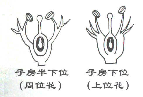 b子房上位周位花 : 花托凹陷或多少膨大呈杯状,子房生在中央,两着彼此分离,雄蕊群、花萼、花冠依次生于花托上部内侧周围,也属于子房上位,但花为周位花如桃 (2)子房半下位 (周位花):花托凹陷呈杯状,子房下半部埋在花托中,并与花托付愈合,上半部与花托分离。如八仙花、锈球花 (3)子房下位: 整个子房埋于杯状花托中,并与花托完全愈合,花的其它部分着生在子房以上花托的顶部。