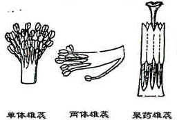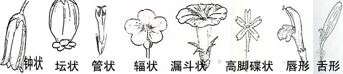 (1)钟状花冠: 花冠筒短而粗,上部钟形,如桔梗科、如党参。 (2)坛状花冠: 花冠筒膨大呈卵形或球形,上部收缩成短颈,花冠裂片向四周辐射状伸展,如荷包牡丹、滇白珠树。 (3)管状花冠: 花冠大部分合生成一管状.如向日葵的盘心花 。 (4)辐状花冠: 花冠筒极短,冠裂片向外辐射状伸展,如枸杞。 (5)漏斗状花冠: 花冠下部筒状,向上渐渐扩大成漏斗状。如牵牛花。 (6)高脚碟状: 花冠下部成细筒状,上部水平状扩展成碟状,如柳兰 、迎春花。 (7)唇形花冠: 花瓣5片,基部合生成管筒,冠裂片稍呈唇形,上面2片合生为上唇,下面三片合生为下唇。如唇形科植物粉红野芝麻、串红 。 (8)舌形花冠: 花冠基部连生成一短筒,上面向一边张开而呈成扁平舌状.如向日葵的盘边花 ,还有蒲公英。 (四)雄蕊群雄蕊群:由一定数目的雄蕊组成,雄蕊由花药、花丝组成。 花药 :呈束状物,是形成花粉粒的地方,一般与花丝相连。 花丝 : 细长,基部生于花托上或贴生于花冠上。 1、雄蕊的类型:
