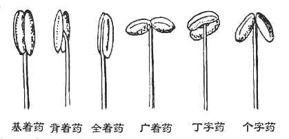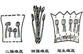 (1)分生雄蕊:即雄蕊多数,彼此分离,长短相近(如桃)。 (2)合生雄蕊 :雄蕊多少合生 (3)单体雄蕊:即雄蕊多数,于花丝下部彼此联合成管状(如黄蜀葵)。 (4)二体雄蕊:即雄蕊10枚,于花丝下部9枚彼此联合,另1枚单独存在,形成2束(如葛)。 (5)三体雄蕊 : 花中雄蕊的药到病除丝完全分离而花丝连合生成三束。如小连翘 (6)多体雄蕊:即雄蕊多数,于花丝下部彼此联合成多束(如金丝梅)。 (7)二强雄蕊:即雄蕊4枚,彼此分离,2枚较长,2枚较短(如茺蔚)。 (8)四强雄蕊 : 花中雄蕊六枚,四长二短。(如十字花科 ) (9)冠生雄蕊:花中雄蕊着生各花冠上。(如茄、紫草等) (10)聚药雄蕊:即雄蕊5枚,于花药,甚至上部花丝彼此联合成管状(如半边莲、旋覆花)。 2、花丝的着生:雄蕊花丝在药隔上的着生方式与位置有: (1)底着:即花丝着生在药隔基部(如莲)。 (2)背着:即花丝着生在药隔近基部(如白花曼陀罗)。 (3)丁着:即花丝着生在药隔中部(如石蒜)。 (4)个着:即花丝着生在药隔顶部,花药叉开形如个字(如地黄)。 3、花药的开裂:雄蕊花药开裂的方式有: (1)孔裂:即花药顶部孔状开裂(如龙葵)。 (2)瓣裂:即花药中部瓣状开裂,并能自动开启如盖(如豪猪刺)。 (3)纵裂:即花药由上至下纵向开裂(如蒲草)。 (五)雌蕊群雌蕊群:由一定数目的雌蕊所组成,雌蕊为花最中心部分的瓶状物,相当干瓶体的下部为子房,瓶颈部为花柱,瓶口部为柱头,而组成雌蕊的爿片则称为心皮。若将子房切开,则所见空间称为子房室,室的外侧为子房壁,室与室间为子房隔膜,子房壁或子房隔膜上着生的小珠或小囊状物为胚珠,胚珠着生的位置为胎座,胎座的上下延伸线是为腹缝线,而腹缝线的对侧则是背缝线。 雌蕊的类型很多,依心皮的联合状况划分有: (1)离生心皮雌蕊:即心皮2个以上,各自于边缘愈合成分离的雌蕊,所成子房为单子房(如乌头)。 (2)合生心皮雌蕊:即心皮2个以上,彼此愈合成1个合生的雌蕊,所成子房为复子房(如藜芦、黄精、葱)。 依子房位置划分有: (1)子房上位:即雌蕊子房着生于凸出或平坦的花托上,而侧壁不与花托愈合。由于花的其它部分的基部位于子房下面,所以又称为花下位。实际上子房仅以底部与花托相连,花的其余部分均不与子房相连。分两种情况:
