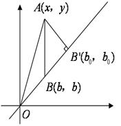 回忆关于直线的学习,由图27可以看到,点B(b,b)是在通过第一象限、与横坐标倾斜45°角的直线上。我们的问题用几何语言可以表述为:在这条直线上寻找一点,使得这一点到给定点A(x,y)的距离最短。显然,这一点应当是点A(x,y)到直线的垂足,设其为B′(b0,b0)。因为