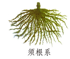 2.须根系。该类根系是无垂直向下生长的主根,由茎的基部长出许多大小粗细相似的丝状或细条状根,故称为须根。许多单子叶植物(如水稻、大麦)的根是须根系的。此根系因生长密度大、分布范围广,所以对土壤表层的水土保持有很大的功能。