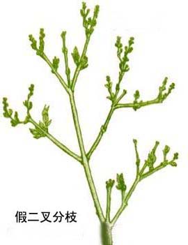 如木犀科、石竹科,如丁香、茉莉、石竹等,主茎顶芽活动到一定的时间就停止生长或死亡,由顶芽下面的一对腋芽同时生长形成两个分枝。每个分枝的顶芽活动到一定时候又停止生长,再由其下面的一对腋芽同时生长,如此继续发育,形成许多二叉状的分枝。因不是由顶端分生组织形成的分枝,故称为假二叉分枝。假二叉分枝存在于具有对生叶序的植物之中。
