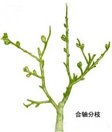 合轴分枝特点是主干的顶芽在经过一些时期生长迟缓,或者很早枯萎,或者为花芽,顶芽下面的腋芽迅速开展,代替顶芽的作用,如此反复交替进行,成为主干。因此,植物的主轴是由主干和相继接替的各级侧枝共同组成,因此称为合轴分枝。合轴分枝可产生较多的分枝和较多的花芽,许多果树具有合轴分枝的特性,如桃、李、苹果等。