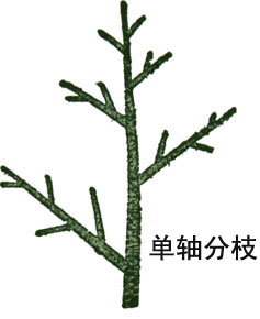 单轴分枝是由主干发生侧枝,侧枝又复侧枝,主干的顶端分生组织继续存在,继续发生作用,每年形成顶芽,顶芽不断向上生长,使主干的引长和加粗大大强于侧枝。各级侧枝由下向上依次细短,树冠呈尖塔形,如柏、杉、水杉、银杉等植物就是单轴分枝。
