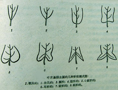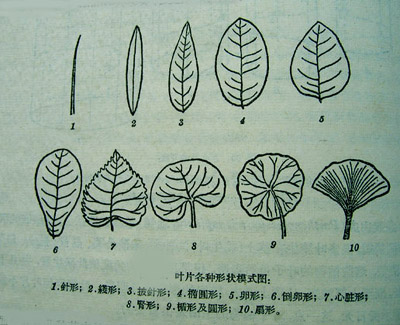 叶的形状 (上)(一)叶片的形状 叶片的形状是指叶片的轮廓,常见的叶形有以下几种: 1. 针形──叶片细长如针,如松的叶。 2.线形──叶片狭长,长度为宽度的5倍以上,又叫带形,如稻、麦等。 3.披针形──叶基较宽,先端尖细,长度约为宽度的3倍,如柳、桃等。 4.椭圆形──全形椭圆,中部最宽,尖端和基部都是圆形,如樟、芫花。 5.卵形──形如鸡卵,下部圆阔,上部稍狭,如向日葵、苎麻等。 6.倒卵形──与卵形相反,叶片上部广阔,下部稍狭,如木兰和马齿苋。 7.心形──形如心脏,基部宽圆而微凹,先端渐尖,如紫荆。 8.肾形──形如肾脏基部凹入,先端钝圆,宽度大于长度,如积雪草、冬葵等。 9.圆形──形如圆盘,长宽接近相等。 10.扇形──形如展开的折扇,顶端宽而圆,向基部渐狭。 11.镰形──呈镰刀状。 12.匙形──形如汤匙,先端圆形,向基部渐狭。 13.鳞形──形如鳞片。 14.三角形──基部宽平,三个边接近相等。 15.掌形──叶片三裂或五裂,全形如手掌。 16. 菱形──呈等边的斜方形。 在叙述叶形时,常用“长”、“广”、“倒”等字眼冠在前面,如椭圆形叶比较长的,叫长椭圆形;卵形叶比较宽的,叫广卵形;与卵形叶上下倒置的,叫倒卵形。就长阔比而言,圆形为1:1,广椭圆形为1.5:1,长椭圆形为3:1,线形为10:1,带形或剑形为6:1。以上长阔比皆为大概数字,因具体植物的叶片可略有上下。
