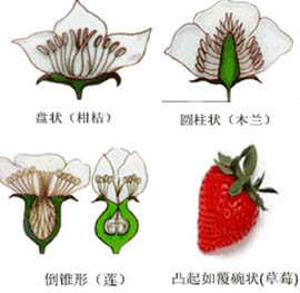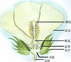 花是种子植物进行有性繁殖的主要器官,是种子植物固有特征之一。花是由枝变态而来的,是不分支的变态短枝。 (一) 花梗花梗: 又称为花柄,为花的支持部分,自茎或花轴长出,上端与花托相连。其上着生的叶片,称为苞叶、小苞叶或小苞片。 (二)花托花托:节间缩短的枝端,为花梗上端着生花萼、花冠、雄蕊、雌蕊的膨大部分。其下面着生的叶片称为付萼。花托常呈凸起、扁平、凹陷等形状, 主要有:盘状(柑桔)、圆柱状(木兰)、凸起如覆碗状(草莓)、凹陷呈碗状(桃)、倒锥形(莲)等。 (三)花被花被:包括花萼与花冠。 1、花萼:为花朵最外层着生的片状物,通常绿色,每个片状物称为萼片,有分离或联合之分。 2、花冠:为紧靠花萼内侧着生的片状物,每个片状物称为花瓣。花冠有离瓣花冠与台瓣花冠之分。 离瓣花冠:即花瓣彼此分离的花冠。花瓣上部宽阔部分,称为瓣片,下面狭窄部分,称为瓣爪。离瓣花冠从形状上又划分:(1)兰形花冠: 由3枚花瓣瓣组成 ,如白及。(2)蝶形花冠: 花瓣5片,常见有旗瓣、翼瓣、龙骨瓣等,花瓣上部宽阔部分,称为瓣片,下面狭窄部分,称为瓣爪 ,如豆科植物、槐等。(3)十字花冠: 花瓣4片, 十字形排列 ,如油菜花。(4)蔷薇型花冠: 花瓣 5片或更多,如蔷薇。(5)距形花冠:如延胡索。 合瓣花冠:即花瓣彼此联合的花冠。花瓣联合的下方狭窄部分称为花冠管部,上方宽阔部分称为花冠舷部,花冠管部与花冠舷部交会处称为花冠喉部,而花冠舷部外侧未联合部分则称为花冠裂片。从外形上,合瓣花冠又划分: