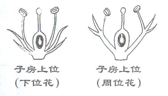 b子房上位周位花 : 花托凹陷或多少膨大呈杯状,子房生在中央,两着彼此分离,雄蕊群、花萼、花冠依次生于花托上部内侧周围,也属于子房上位,但花为周位花如桃 (2)子房半下位 (周位花):花托凹陷呈杯状,子房下半部埋在花托中,并与花托付愈合,上半部与花托分离。如八仙花、锈球花 (3)子房下位: 整个子房埋于杯状花托中,并与花托完全愈合,花的其它部分着生在子房以上花托的顶部。