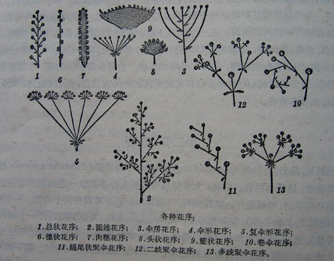 花序花序:花在花枝(花轴)上排列的方式称为花序。花轴有主轴与侧轴之分,一般由顶芽萌发出的为主轴,由腋芽萌发出或自主轴分枝出的为侧轴。花轴又有长短之分,花轴的节间长的为花轴长,花轴的节间短的为花轴短。 花序的类型很多,主要根据主轴顶端是否能无限生长,(或花开放的顺序)、主侧轴的长短、分枝状况及质地等来划分。通常分为无限花序、有限花序及混合花序三大类: 1.无限花序:为花序主轴顶端能不断生长,花开放的顺序,是由下向上或由周围向中央,最先开放的花是在花序的下方或边缘。这类花序包括: (1)总状花序:为主轴、侧轴皆较长,侧轴不再分枝,且长短大小相近的花序(如荠莱)。 (2)伞房花序:为主轴、侧轴皆较长,侧轴虽不再分枝,但下方侧轴远较上方侧轴为长,至顶面略近于齐平的花序(如麻叶绣球)。 (3)复总状花序:为主轴、侧轴皆较长、侧轴又再作总状分枝的花序。此种花序因形状略似一圆锥,所以又称为圆锥花序(如南天竹)。 (4)穗状花序:为主轴长,侧轴短,侧轴不再分枝,而主轴较硬,直立,粗细较正常的花序(如车前草)。 (5)ROU荑花序:为主轴长,侧轴短,侧轴不分枝或微分枝,但主轴较细坎,通常弯曲下垂的花序。其上着生的花常为单性花(如枫杨)。 (6)肉穗花序:为主轴长,侧轴短,侧轴不分枝或微分枝,但主轴较肥大的花序。 由于其外常有一极长大状如烛焰的总苞,所以又称为佛焰花序(如天南星)。 (7)复穗状花序:为主轴长,侧轴短,而侧轴再作穗状分枝的花序(如大麦)。 (8)伞形花序:为主轴短,侧轴长,侧轴不再呈伞状分枝的花序(如五加)。 (9)复伞形花序:为主轴短,侧轴长,而侧轴上端又再呈伞状分枝的花序(如柴胡)。 (10)球穗花序:为主轴短,侧轴亦短,且主轴顶端较肥大凸出,而略近于球形的花序(如喜树)。 (11)头状花序:为主轴短,侧轴亦短,主轴顶端虽亦肥大,但较平坦或微凹的花序。由于其外形略似花篮,所以又称为篮状花序(如旋覆花)。 (12)隐头状花序:为主轴短,侧轴亦短,但主轴顶端极度肥大,并明显凹陷呈坛状,花陷藏着生于坛状花轴内的花序(如无花果)。 2. 有限花序:为花序主轴顶端先开一花,因此主轴的生长受到限制,而由侧轴继续生长,但侧轴上也是顶花先开放,故其开花的顺序为由上而下或由内向外。这类花序包括: (1)镰状聚伞花序:为主轴上端节上仅具一侧轴,分出侧轴又继续向同侧分出一侧轴,整体形状略似一镰刀的花序。因其常呈螺状卷曲,所以又称为螺状聚伞花序(如附地菜)。 (2)蝎尾聚伞花序:为主轴上端节上仅具一侧轴,所分出的侧轴又继续向两侧交互分出一侧轴,整体形状略似一蝎尾的花序(如香雪兰)。 (3)二歧聚伞花序:主轴上端节上具二侧轴,所分出侧轴又继续同时向两侧分出二侧轴的花序(如繁缕)。 (4)多歧聚伞花序:主轴上端节上具三个以上侧轴,分出侧轴又作聚伞状分枝(如大戟)。 此外,尚有一种特殊的有限花序称为轮伞花序,此种花序的排列与结构为:在植物茎上端具对生叶片的各个叶腋处,分别着生有两个细小的聚伞花序、故各茎节处有四个小花序着生呈轮状,如此各节层层向上排列、即构成了此种轮伞花序。轮伞花序严格说来,不是一种独立的花序类型,而只是聚伞花序的一种特殊排列着生形式(如茺蔚)。 |