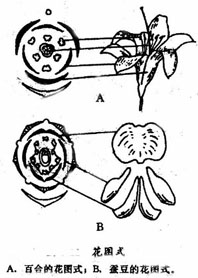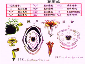花图式记载法:即以一定符号所表示的一种花的横切面投影图。此法的优点是能较形象的反映出各部的结构与排列。此法的缺点是需绘图,故记载稍繁而费时,同时不能表达出子房的位置着生情况及胚珠数等纵向结构。 (1)花的组成:花轴、苞干、萼片、被片、瓣片、雄蕊、心皮。 (2)花的结构:1)“--:连合2)“……”:成轮3)“×”:缺乏。