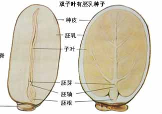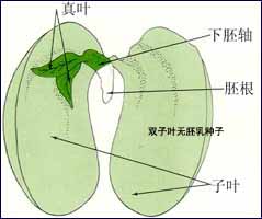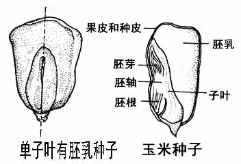 即种胚有1片子叶,且有胚乳的种子,如水稻、小麦、玉米、高梁、洋葱等植物的种子,都属于这个类型。 (二) 依子叶与胚根卷曲、折迭的方式划分: (1)种胚直生、子叶平展的种子:即种胚的胚根不弯曲,子叶平展不折迭的种子(如木蝴蝶)。 (2)种胚直生、子叶一侧卷旋的种子:即种胚的胚根不弯曲,子叶一侧折迭呈卷旋状的种子(如诃子)。 (3)种胚直生、子叶两侧折迭的种子:即种胚的胚根不弯曲,子叶两侧同时折迭的种子(如苘麻)。 (4)种胚直生、子叶皱缩折迭的种子:即种胚的胚根不弯曲,子叶皱缩而呈多次不规则折迭的种子(如裂叶牵牛)。 (5)种胚弯生、七子叶缘倚(或直迭)的种子:即种胚的胚根弯曲,并与子叶的叶缘靠近的种子:(如补骨脂)。 (6)种胚弯生、子叶背倚(或横迭)的种子:即种胚的胚根弯曲,并与予叶背面靠近的种子(如麦兰菜)。